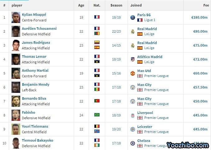 1、姆巴佩:18/19赛季→巴黎(1.8亿欧)
