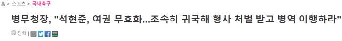 24直播网讯 据韩国媒体报道,效力于法乙特鲁瓦的韩国球员石现俊逃兵役,被外交部被取消护照资格,并被韩国兵务厅勒令回国服兵役。