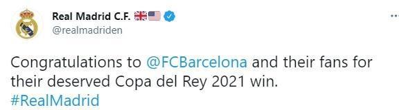 皇马官方发文写道:“祝贺巴萨和巴萨球迷们获得2021年国王杯冠军!”