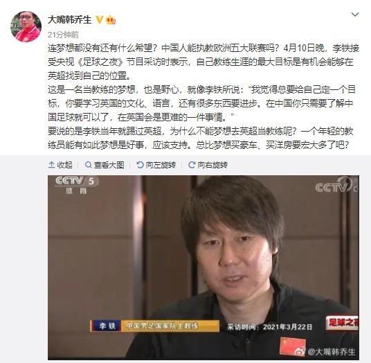 韩乔生写道:“连梦想都没有还有什么希望?中国人能执教欧洲五大联赛吗?李铁接受采访时表示,自己教练生涯的最大目标是有机会能够在英超找到自己的位置,这是一名教练的梦想,也是野心。要说的是李铁当年就踢过英超,为什么不能梦想去英超当教练呢?一个年轻的教练员能有如此梦想是好事,应该支持。总比梦想买豪车、买洋房要宏大多了吧?”