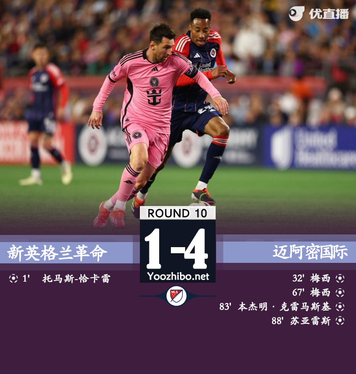 北京时间4月28日7点30分,美职联第10轮,迈阿密国际客场对阵新英格兰革命。上半场,尚卡莱开场不到1分钟就破门,梅西单刀扳平比分。下半场,梅西完成双响,克雷马斯和苏亚雷斯先后进球锁定胜局。全场比赛结束,迈阿密国际4-1新英格兰革命继续领跑东区。梅西本场比赛完成双响后本赛季10场比赛打进11球,联赛7场9球领跑MLS射手榜,近3场连续破门。