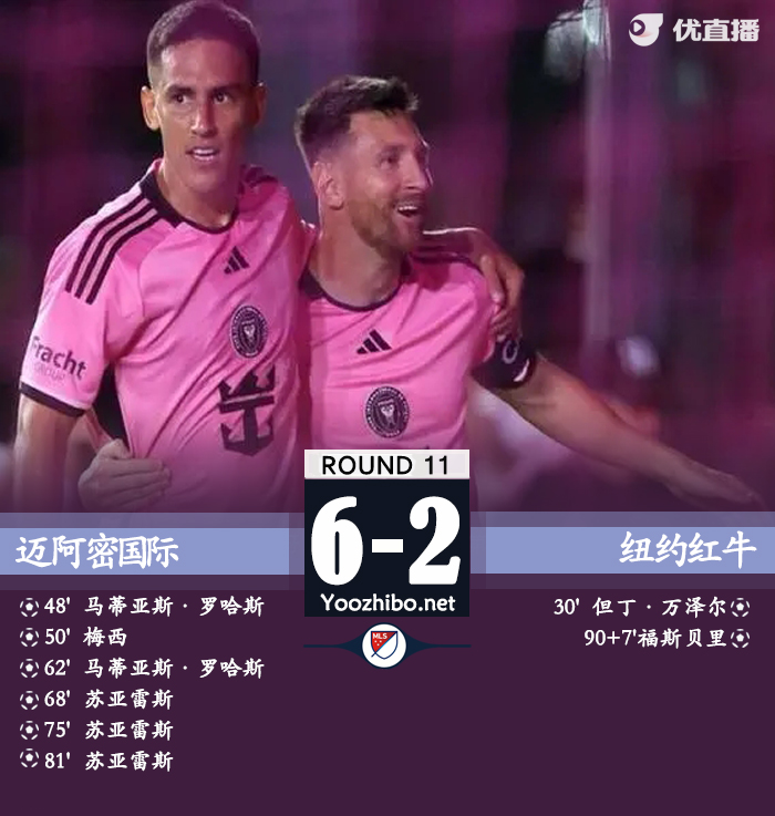 北京时间5月5日7点30分,美职联第11轮迈阿密国际主场迎战纽约红牛。上半场,迈阿密占据优势多次施压,范泽尔补射破门,阿伟莱斯头球中框。下半场,罗哈斯替补完成双响,梅西进球后苏亚雷斯带帽。全场比赛结束,迈阿密国际6-2纽约红牛。梅西本场比赛完成破门后本赛季11场比赛打进12球,联赛8场10球领跑MLS射手榜,近4场连续破门。