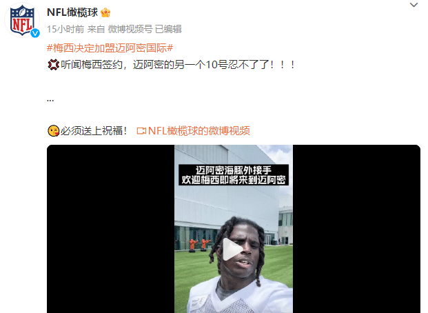 梅西官宣加盟迈阿密国际之后的第一个挑战来了,这是NFL官方发布了一段视频,配文:“听闻梅西签约,迈阿密的另一个10号忍不了了,必须送上祝福!”