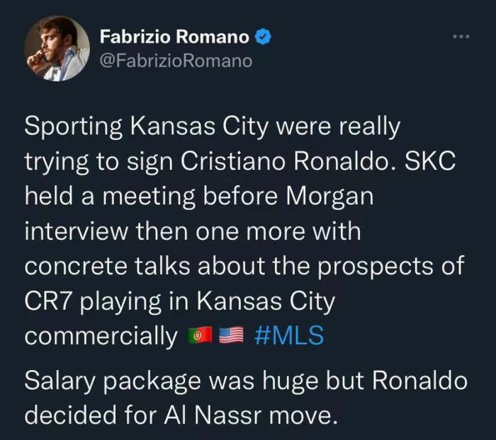 罗马诺表示,堪萨斯城真的很想签下C罗,在C罗接受摩根的采访前,堪萨斯城曾经开过一个会议,之后他们又开过一个会议,目的在于探讨C罗加盟后的商业前景。