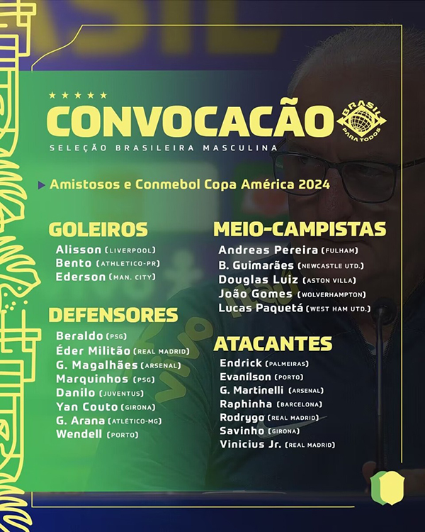 24直播网讯 北京时间5月10日晚,巴西a男足临时主帅公布了美洲杯23人参赛名单。威尼休斯、罗德里戈、米利唐、马尔基尼奥斯、埃德森、阿利松、拉菲尼亚等名将悉数入围,皇马17岁天才恩德里克也在列。头号球星内马尔因伤缺席,阿森纳射手热苏斯和曼联后腰卡塞米罗、边锋安东尼则遗憾落选。同样无缘名单的还有热刺射手理查利森、尤文中卫布雷默。