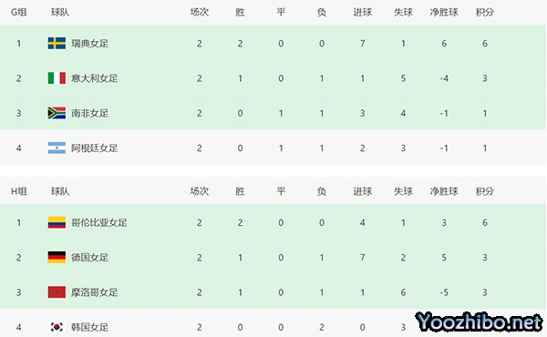 G组的瑞典女足已经晋级,她们取得两连胜的同时7个进球丢1球, 表现堪称完美。意大利女足位置并不稳定,同样都是1分的南非和阿根廷女足则需要努力了,最后殊死一搏。H组的哥伦比亚队6分占据晋级的主动权,摩洛哥女足爆冷击败德国队,隔空拯救了韩国队,当然末战德国队迎战韩国女足,实事求是的讲,德国队晋级的概率还是要更高,韩国队被续命,但依旧命悬一线。