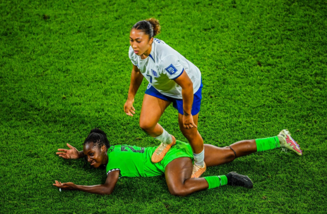 下半场一开始,尼日利亚卡努头球,再度击中横梁。随后的比赛波澜不惊,尤其是英格兰几乎没有创造得分机会。第84分钟,心态失衡的劳伦·詹姆斯故意踩踏尼日利亚球员后背,经过VAR提示,裁判掏出红牌将她罚下。此后,局势完全被尼日利亚掌控。90分钟双方0-0,比赛进入加时。加时赛,尼日利亚依然掌控局面,但始终未能破门,双方进入点球决战。