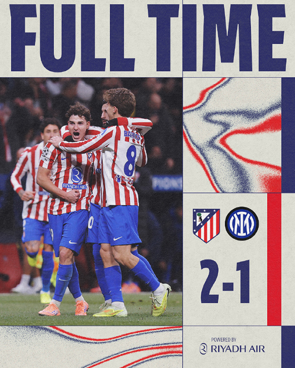 欧冠-国米1-2马竞 吉梅内斯补时绝杀 阿尔瓦雷斯破门