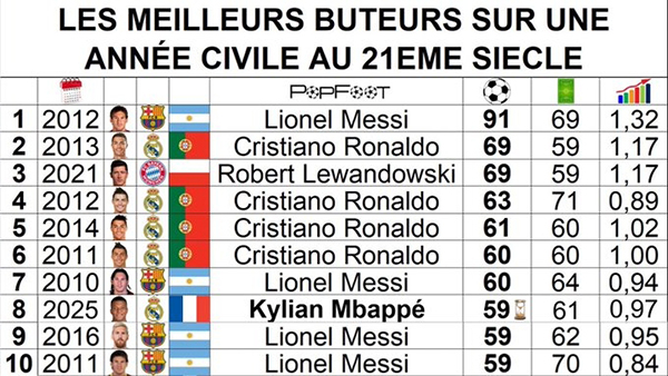 年度射手榜更新:姆巴佩59球跻身后梅西时代,距91球神迹仍差32球