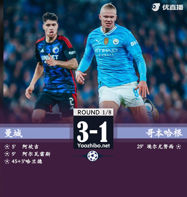 24直播网讯 北京时间3月7日凌晨4:00,2023-24赛季欧冠1/8决赛次回合,曼城坐镇伊蒂哈德球场迎战哥本哈根,首回合蓝月亮3-1获胜。上半场阿尔瓦雷斯开场9分钟传射建功,阿坎吉破门,埃尔尤努西扳回一球,补时阶段哈兰德进球,曼城暂3-1哥本哈根;下半场努内斯摔倒导致手指90°弯折受伤,随后被换下,两队都没有再改写比分,最终曼城3-1哥本哈根,总比分6-2晋级1/4决赛。