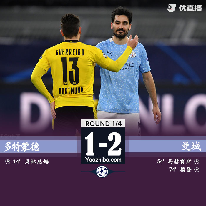 北京时间4月15日凌晨3点整,2020-21赛季欧冠1/4决赛次回合在伊杜纳信号公园球场展开角逐,多特蒙德坐镇主场迎战曼城。上半场贝林厄姆首开纪录,德布劳内中框,下半场埃姆雷-詹送点,马赫雷斯点射扳平,福登爆射反超比分。最终曼城客场2-1战胜多特蒙德,总比分曼城4-2淘汰多特晋级四强,曼城半决赛将对阵巴黎圣日耳曼。