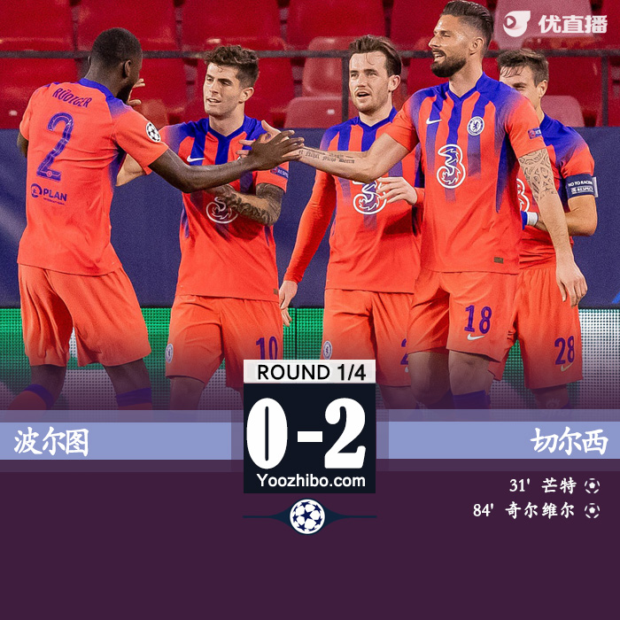北京时间04月08日星期四03:00,欧冠1/4决赛首回合波尔图迎战切尔西。上半场比赛,若日尼奥助攻,芒特破门,切尔西半场1-0领先波尔图,蓝军上半场仅仅一脚射门就取得进球。下半场,普利西奇射门中框,奇尔维尔扩大比分。最终,波尔图0-2不敌切尔西。两队4月14日的次回合交锋,仍将在皮斯胡安球场进行。