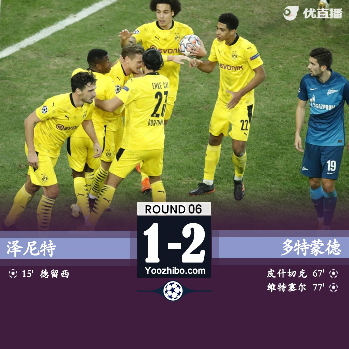 北京时间12月9日01:55,欧冠小组赛F组第6轮泽尼特对阵多特蒙德。上半场比赛,德里尤西破门,阿兹蒙进球被吹越位,泽尼特半场1-0领先多特。下半场比赛,皮什切克、维特塞尔先后破门。最终,多特蒙德客场2-1逆转圣彼得堡泽尼特,6场小组赛4胜1平1负,以F组小组榜首身份出线。