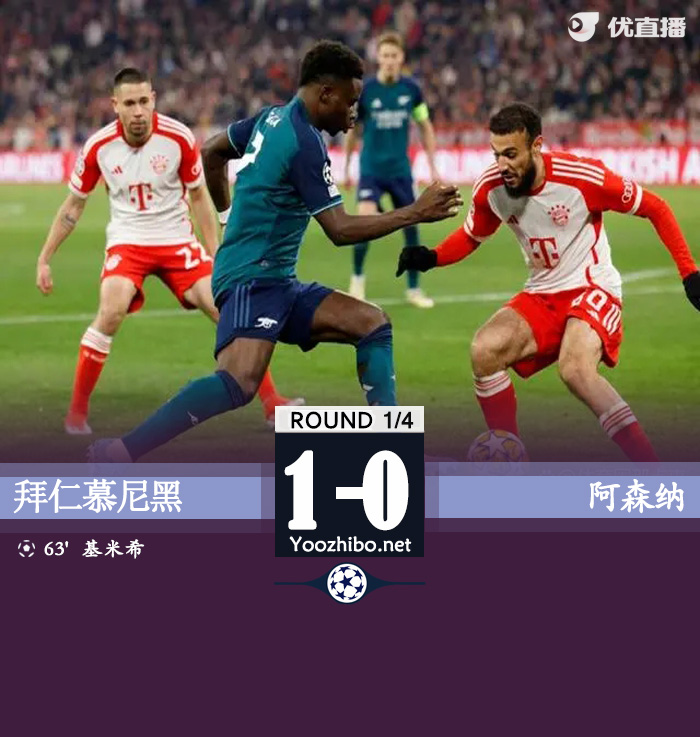 北京时间4月18日欧洲冠军联赛 1/4决赛次回合,拜仁慕尼黑主场对阵阿森纳。凯恩开场连续打门造险,穆西亚拉远射被扑,马丁内利推射被诺伊尔没收,下半场格雷茨卡和格雷罗先后中柱,基米希头球冲顶破门。最终比分拜仁 1-0 阿森纳。两回合总比分拜仁3-2阿森纳。