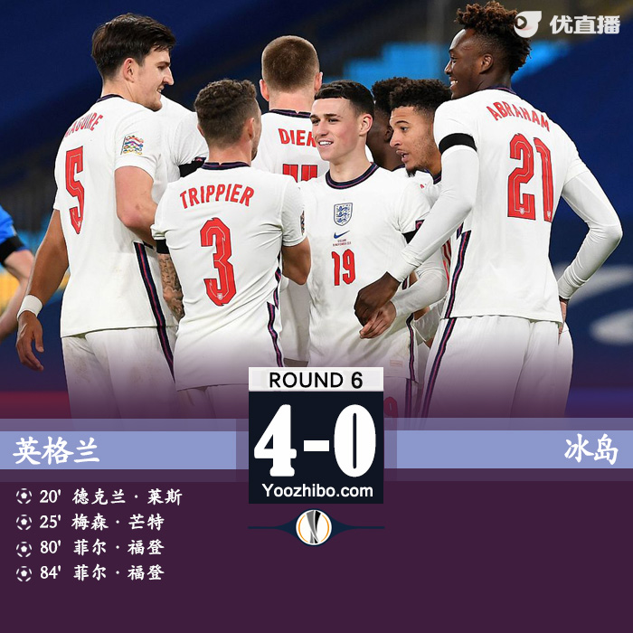 24直播网讯:北京时间11月19日03:45(英国当地时间18日19:45),2020/21赛季欧国联A组第2小组第6轮一场焦点战在温布利大球场展开争夺,英格兰主场4比0大胜冰岛,莱斯和芒特进球,福登梅开二度。英格兰终结连败,冰岛全负垫底。这是两队第5次交锋,此前英格兰取得2胜1平1负。马奎尔、福登和萨卡轮换出场。