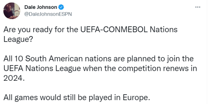 该记者表示,全部南美十个国家,将在2024年加入欧洲国家联赛,不过到时所有的比赛都会在欧洲进行。