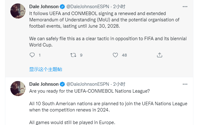 24直播网12月18日讯 2024年欧国联重启时,南美的10个国家都会加入,所有比赛都会在欧洲进行。欧足联和南美足联签订了一份到2028年6月30日的赛事举办备忘录,这是在对抗国际足联和他们两年一届的世界杯。