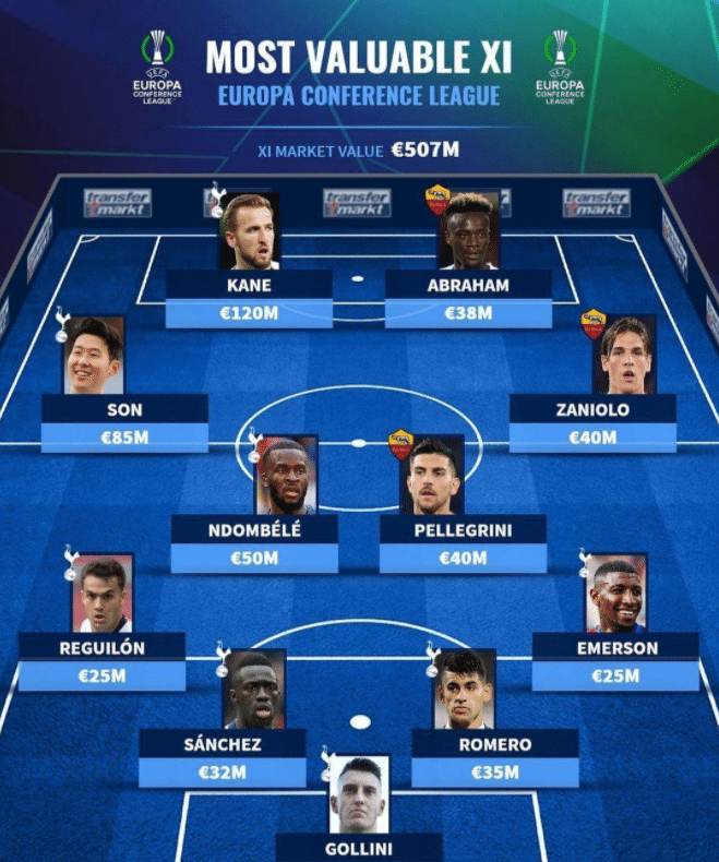 如图,门将位置上是热刺新援格里尼,身价是1700万欧元。后防线上的四人全部来自热刺,分别是身价2500万欧元的雷吉隆,身价3200万欧元的桑切斯,身价3500万欧元的罗梅罗和身价2500万欧元的埃莫森。中场方面,两个来自热刺两人来自罗马,分别是身价8500万欧元的孙兴慜和身价5000万欧元的恩东贝莱,以及身价4000万欧元的佩莱格里尼和身价4000万欧元的扎尼奥洛。而前场分别是身价1.2亿欧元的凯恩和身价3800万欧元的亚伯拉罕。
