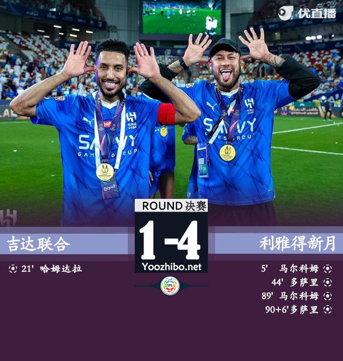 北京时间4月12日沙超杯决赛,吉达联合主场对阵利雅得新月。吉达联合哈默德破门。上半场,萨利赫-谢赫里助攻马尔科姆破门,率先改写比分。哈默德造点主罚被扑,补射将球打进将比分扳平。萨利赫-谢赫里助攻萨勒姆-达瓦萨里破门,将比分再次超出。下半场,哈默德越位在先,进球被吹无效。阿卜杜勒哈米德越位在先,进球被吹无效。马尔科姆破门完成梅开二度再下一城。纳赛尔-达乌萨里补射破门锁定比分。最终利雅得新月4-1战胜吉达联合取34连胜,夺得23~24赛季沙超杯冠军。