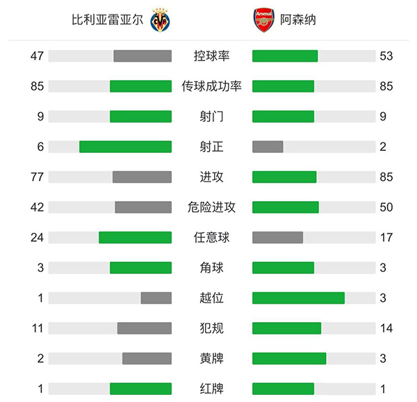 全场比赛结束,比利亚雷亚尔2-1阿森纳。