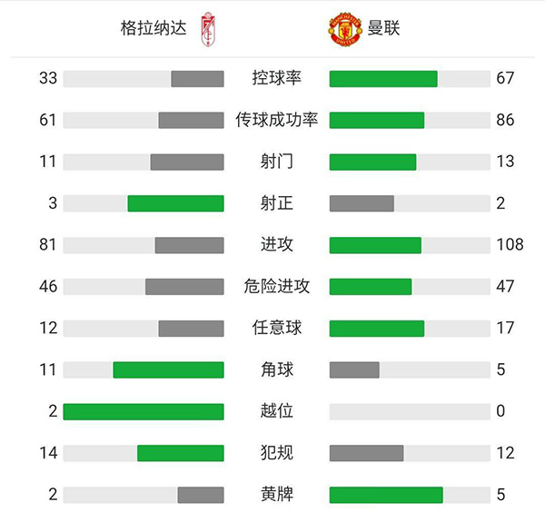 全场比赛结束,曼联2:0战胜格拉纳达,占得先机。