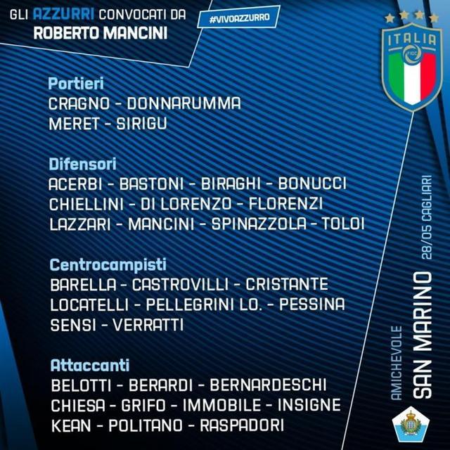 前锋:贝洛蒂(都灵),贝拉尔迪(萨索洛),贝尔纳代斯基(尤文),小基耶萨(尤文),格里弗(弗赖堡),因莫比莱(拉齐奥),因西涅(那不勒斯),莫伊塞-基恩(巴黎),波利塔诺(那不勒斯),拉斯帕多里(萨索洛)