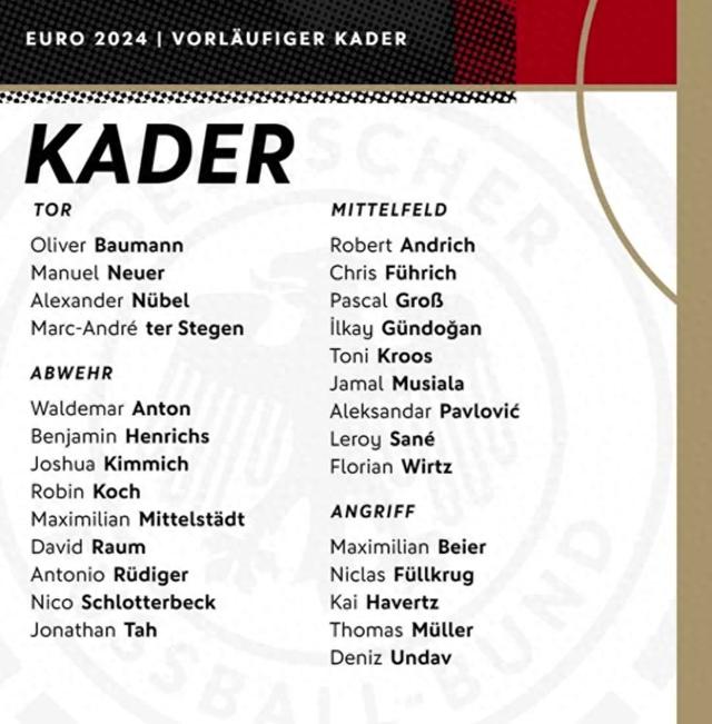 24直播网讯 今天德国足协公布了德国队27人的欧洲杯初选名单,各俱乐部球员分布如下:
