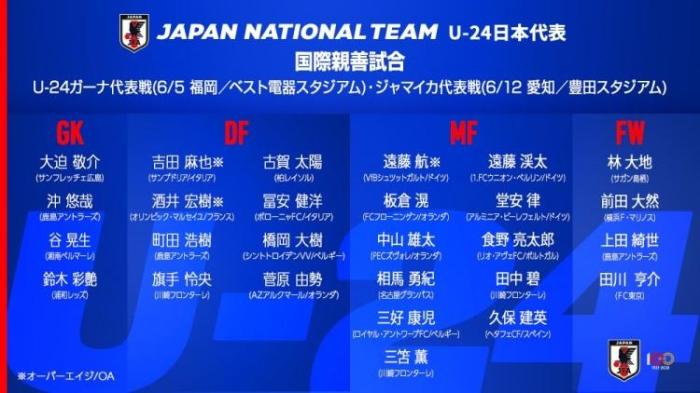 24直播网讯 今天,日本足协公布了新一期的国奥队大名单,吉田麻也、酒井宏树和远藤航将作为超龄球员参加东京奥运会。