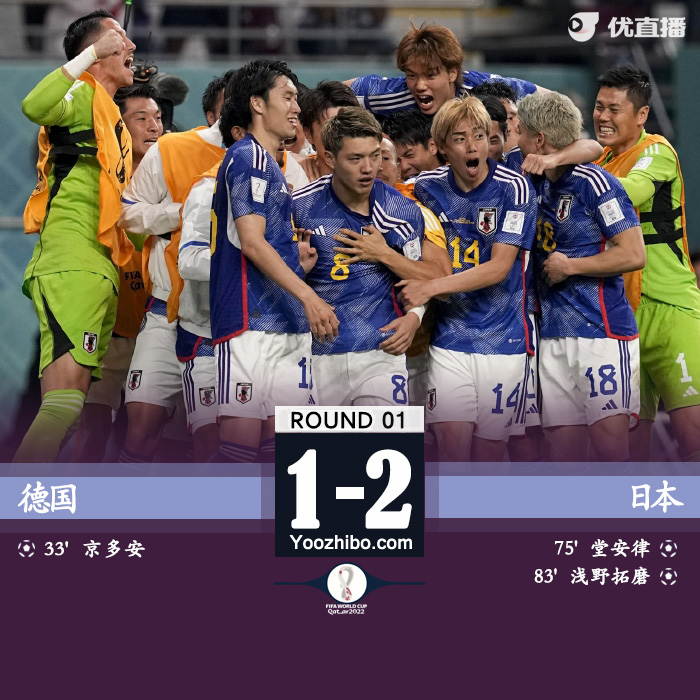 北京时间11月23日晚上21:00,世界杯E组首轮,德国对阵日本。上半场,劳姆造点京多安主罚命中。下半场,格纳布里中框,京多安中柱,权田修一屡献神扑,酒井宏树失空门,替补登场的堂安律和浅野拓磨先后破门逆转比分。全场结束,德国1-2日本爆出大冷门。