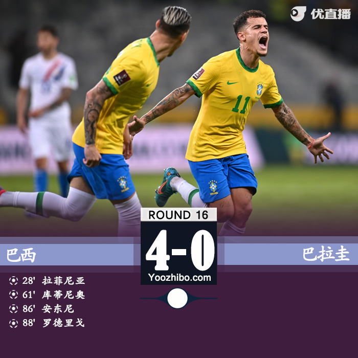 北京时间2月2日8:30,卡塔尔世界杯南美预选赛第16轮巴西主场迎战巴拉圭的比赛。上半场拉菲尼亚闪击被吹后低射破门,半场战罢,巴西1-0巴拉圭。下半场拉菲尼亚中柱,库蒂尼奥远射世界波破门,安东尼、罗德里戈替补再进两球,最终巴西4-0大胜巴拉圭保持不败。