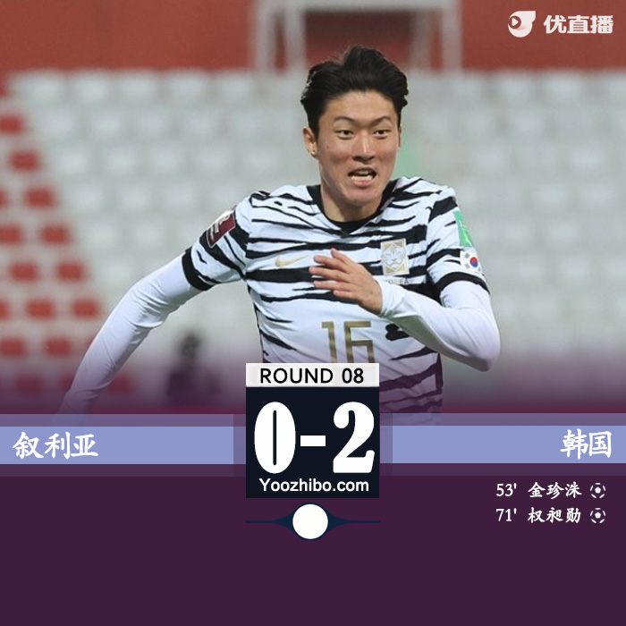 北京时间2月1日22:00,世界杯亚洲区预选赛12强赛A组第8轮,韩国对阵叙利亚。上半场,赫里宾头球破门但越位在先,金珍洙险些失误送礼,两队均未进球;下半场,金珍洙头球破门打破僵局,权昌勋世界波锁定胜局。最终,韩国2-0击败叙利亚,提前2轮获得世界杯参赛资格。