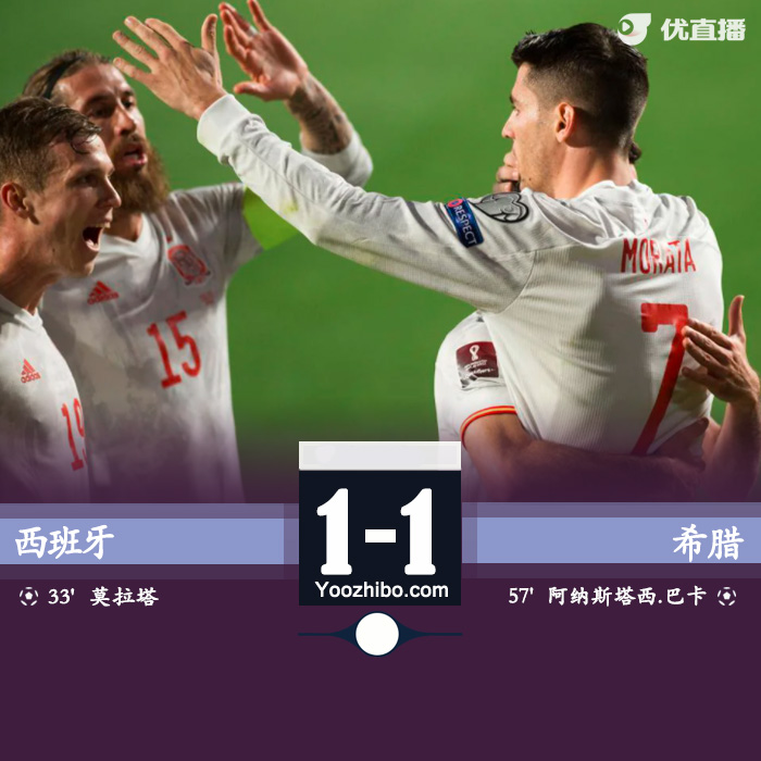 北京时间03月26日星期五03:45,世预赛欧洲区B组西班牙对阵希腊世界杯预选赛打响。上半场,科克助攻莫拉塔首开记录,半场西班牙1-0领先希腊。下半场,马丁内斯替补登场被判罚黄点套餐,巴卡斯塔斯点射扳平。最终,西班牙1-1战平希腊,双方各取1分。