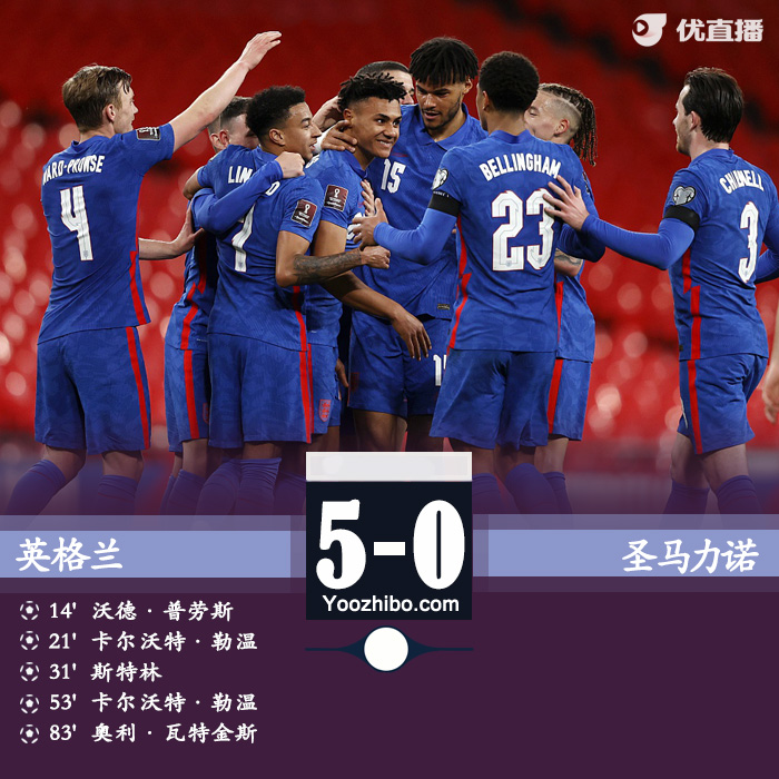 北京时间3月26日03:45,世界杯欧洲区预选赛I组首轮展开争夺,英格兰迎战圣马力诺。上半场,沃德-普劳斯打入国家队处子球,里斯-詹姆斯助攻勒温头球破门,芒特助攻斯特林扩大比分。下半场,林加德助攻勒温打进第4球,沃特金斯替补上场也打进国家队处子球,最终,英格兰5-0大胜圣马力诺,取得开门红。