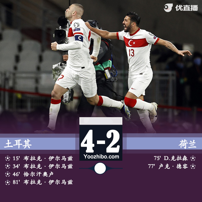 北京时间3月25日1点,世预赛欧洲赛区G组荷兰客场对阵土耳其。上半场,伊尔马兹先是远射破门,随后他又打进点球,德里赫特头球中柱。下半场,恰尔汗奥卢轰进世界波,克拉森和卢克德容替补登场后在两分钟内连追两球,伊尔马兹任意球直接破门完成帽子戏法同时为土耳其锁定胜局,补时阶段卡巴克送点,恰基尔将点球扑出,全场比赛结束,土耳其4-2荷兰。