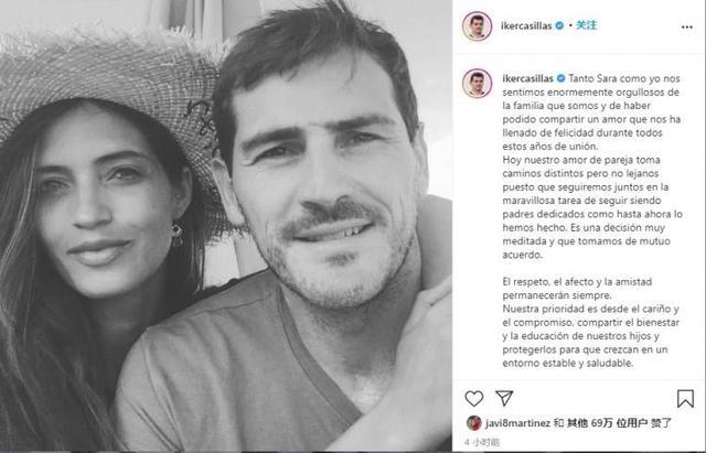 24直播网讯3月13日 卡西和妻子萨拉-卡博内罗在ins证实她与卡西利亚斯已经分手,结束了这段12年的感情。