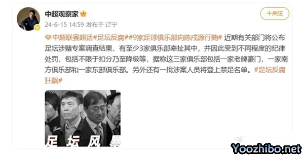 而在中国国足意外进入了世预赛亚洲区18强后,知名的体育人“中超观察家”也是在社交媒体上透露了足坛风暴的情况,在社交媒体上,“中超观察家”以9家俱乐部向陈码头送钱为标签爆料:近期,有关部门将公布此前的调查结果,有至少3家俱乐部牵扯其中,并因此受到不同程度的纪律处罚,包括不限于扣分乃至降级,据悉,这三家俱乐部包括了一家老牌豪门,一家南方俱乐部和一家东部俱乐部,另外还有一批相关人员将被禁足。