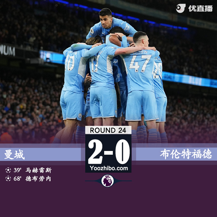 北京时间2月10日03:45,英超第24轮继续进行,曼城主场迎战布伦特福德。上半场,斯特林制造点球,马赫雷斯主罚命中。下半场,德布劳内利用大卫-拉亚的失误再入一球。最终,曼城2-0战胜布伦特福德14轮不败,12分优势继续领跑积分榜。