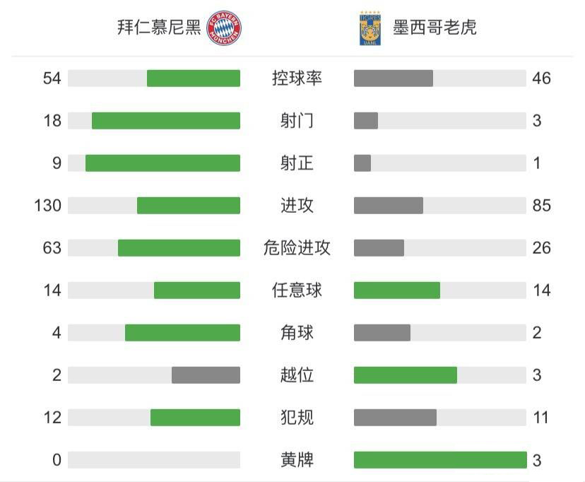 查看:拜仁慕尼黑vs老虎大学 全场录像技术统计: