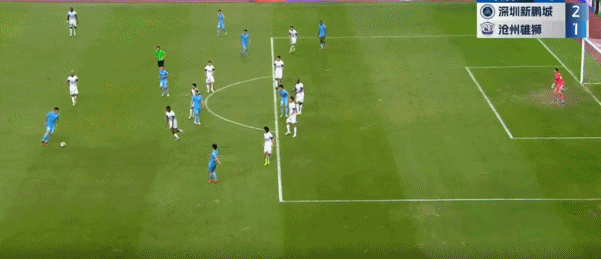 第45+7分钟,张煜东挑传,张卫插上垫射破门反超比分,新鹏城2-1沧州