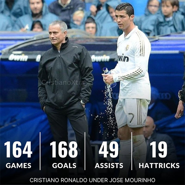 数据显示,C罗在穆帅执教的皇马踢了164场比赛,打入168球,助攻49次,完成19次帽子戏法。被问到在执教皇马期间教了C罗什么时,穆帅回答道:「我不这么认为,他不需要。」