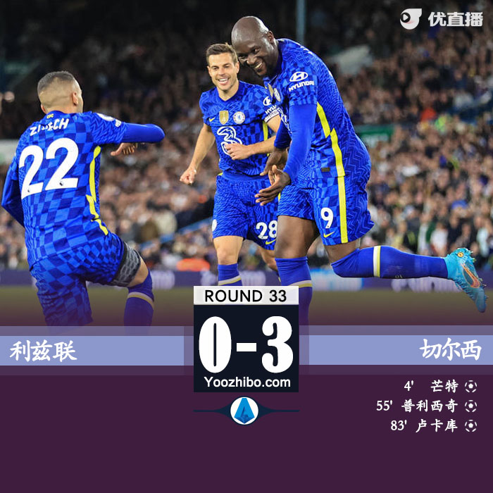 北京时间5月12日凌晨2点30分,2021-22赛季英超第33轮补赛在埃兰路球场展开角逐,切尔西客场挑战利兹联。上半场芒特首开纪录,丹尼尔-詹姆斯飞铲染红,科瓦西奇伤退,下半场芒特助攻,普利西奇扩大比分,卢卡库1V3破门。最终切尔西客场3-0完胜利兹联,蓝军终结联赛三轮不胜。积分榜方面,切尔西积70分仍居第3,利兹联积34分位列倒数第三。
