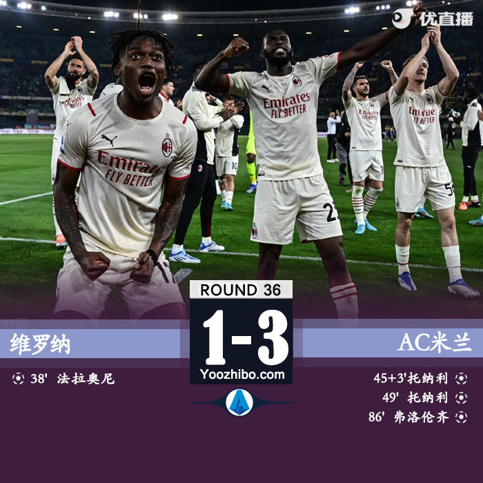 北京时间5月9日凌晨2点45分,2021-22赛季意甲第36轮在本特戈蒂球场展开角逐,AC米兰客场挑战维罗纳。上半场法拉奥尼先拔头筹,莱奥助攻托纳利扳平,下半场莱奥再次助攻托纳利反超,弗洛伦齐替补锁定胜局。最终AC米兰客场3-1逆转维罗纳,积分榜方面,AC米兰积80分领先国米2分,重回榜首,维罗纳积52分位列第9。