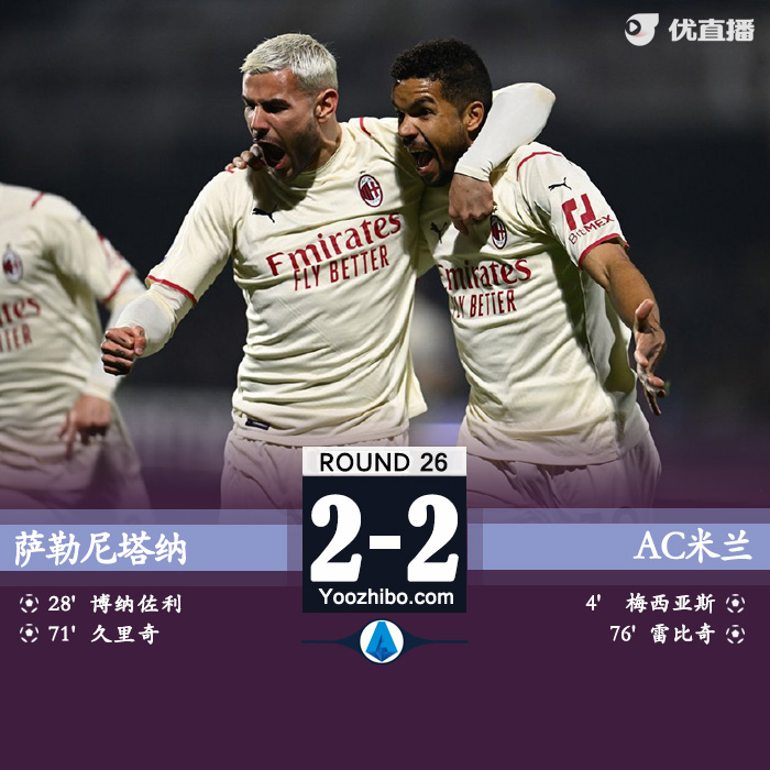 北京时间凌晨3:45,2021-22赛季意甲联赛第26轮,AC米兰客场挑战萨勒尼塔纳。上半场,特奥送出直塞,梅西亚斯破门,博纳佐利利用一次反击机会为萨勒尼塔纳扳平比分;下半场久里奇帮助萨勒尼塔纳反超比分,不过很快雷比奇取得进球,最终AC米兰2-2萨勒尼塔纳。
