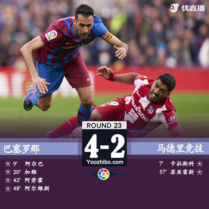 北京时间2月6日23:15,西甲联赛第23轮巴萨主场迎战马竞的比赛。上半场卡拉斯科推射破门,阿尔巴凌空世界波扳平,加维头球反超,阿劳霍补射破门,半场巴萨3-1马竞。下半场易边再战,阿尔维斯破门后染红,苏亚雷斯为马竞扳回一球,最终,巴萨4-2马竞。