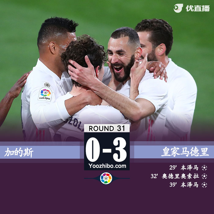 北京时间04月22日星期四04:00,西甲第31轮加的斯主场迎战皇家马德里。上半场,本泽马两射一传,奥德里奥索拉破门,维尼修斯造点。皇马半场暂3-0领先加的斯。下半场,皇马攻势没有转化成进球。最终,皇马客场3-0加的斯。皇马各项赛事16场不败,联赛先赛一场积分平马竞,凭相互战绩登顶。