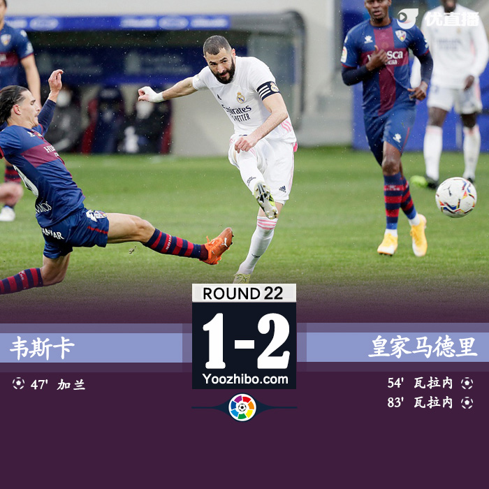 北京时间2月6日晚23点15分,2020-21赛季西甲第22轮在阿尔科拉斯球场展开角逐,皇家马德里客场挑战韦斯卡。上半场维尼修斯失良机,下半场加兰世界波,瓦拉内梅开二度,奥德里奥索拉伤退。最终皇家马德里客场2-1逆转战胜韦斯卡,积分榜方面,皇马积43分距榜首7分。