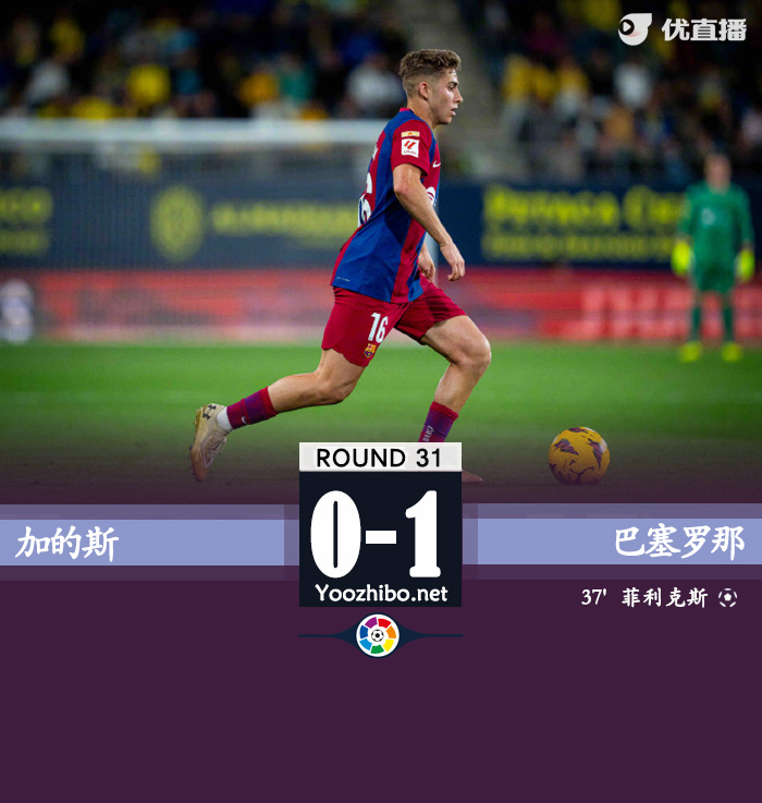 北京时间4月14日,西甲联赛第31轮,加的斯队主场迎战巴塞罗那队。上半场,菲利克斯倒钩破门。随后,费尔明的射门被加的斯丘斯特门线极限解围。下半场,两队均无建树。全场比赛结束,巴萨客场1-0击败加的斯,取得各项赛事6连胜,西甲联赛距离榜首的皇马还有8分之差。