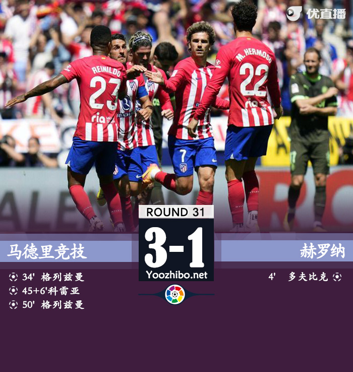 北京时间4月13日西甲联赛第31轮,马德里竞技主场迎战赫罗纳。格列兹曼为马德里竞技攻入两球,安赫尔-科雷亚也有一次得分。赫罗纳的多夫比克也有一次进球。最终比分是马竞3-1赫罗纳。