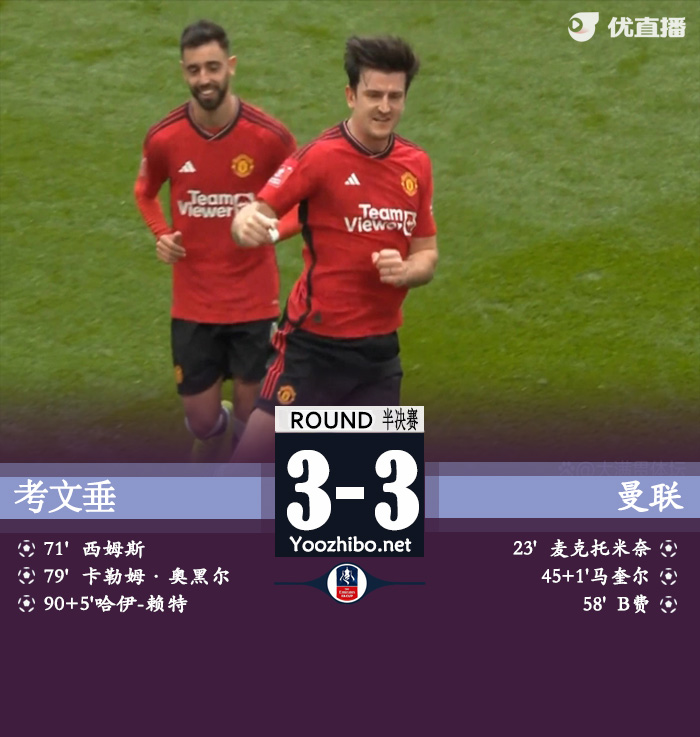 北京时间4月21日22:30,足总杯半决赛在温布利大球场继续进行,曼联对阵英冠球队考文垂,本场主裁判为罗伯特-琼斯。上半场,麦克托米奈首开记录,B费角球助攻马奎尔头槌再下一城。下半场,B费破门帮助曼联三球领先;随后场上风云突变,西姆斯传射,奥哈雷远射变线入网,万-比萨卡补时送点,哈吉-赖特点射绝平,考文垂连扳三城奇迹般将比赛拖入加时赛。加时赛中,B费与西姆斯先后中楣,托尔普绝杀无效。点球大战中,卡塞米罗罚失,奥纳纳扑点,本-谢夫打飞,霍伊伦罚入制胜点球。最终,曼联总比分7-5惊险淘汰考文垂,与曼城会师足总杯决赛。