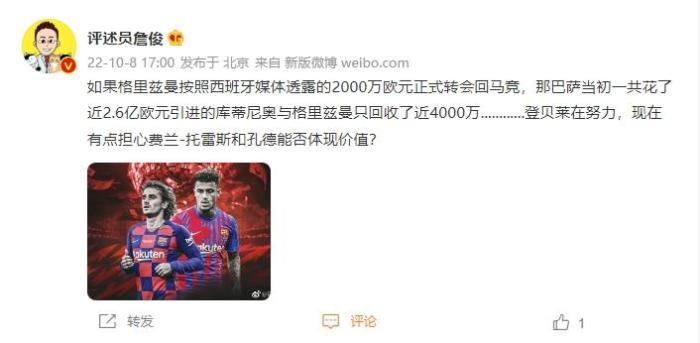24直播网10月08日消息,多家西班牙媒体称马竞2000万欧买断格里兹曼,詹俊发微博表达了对这笔转会的看法。